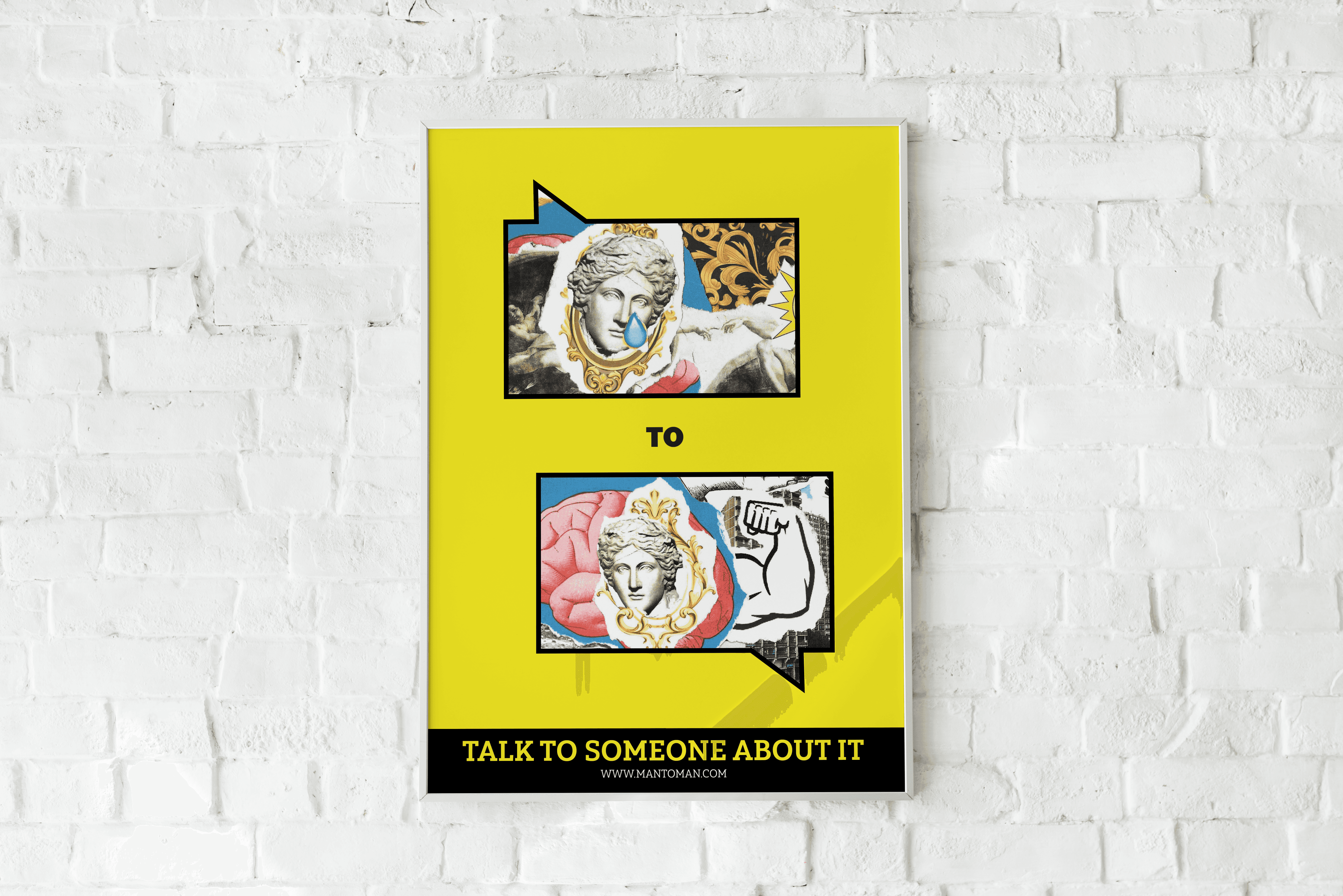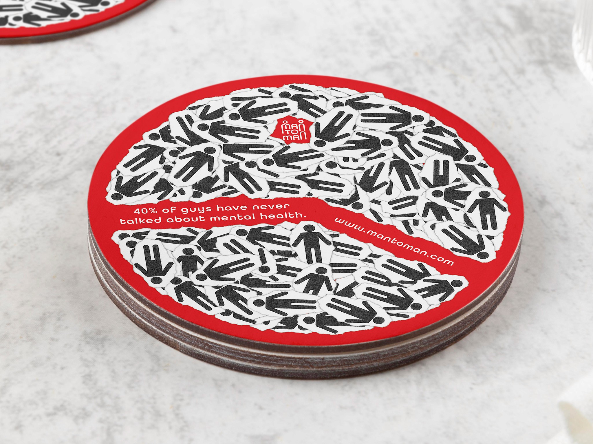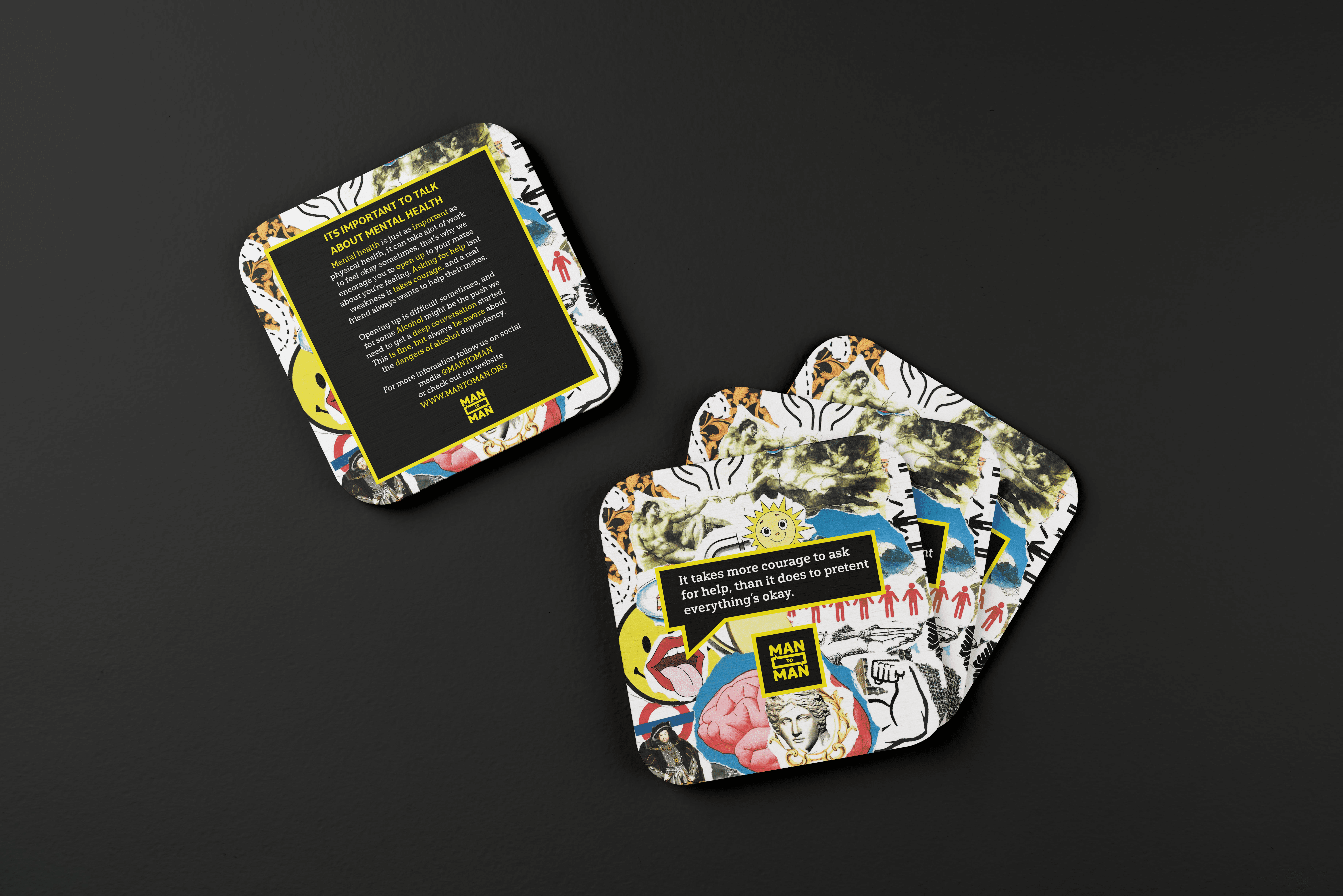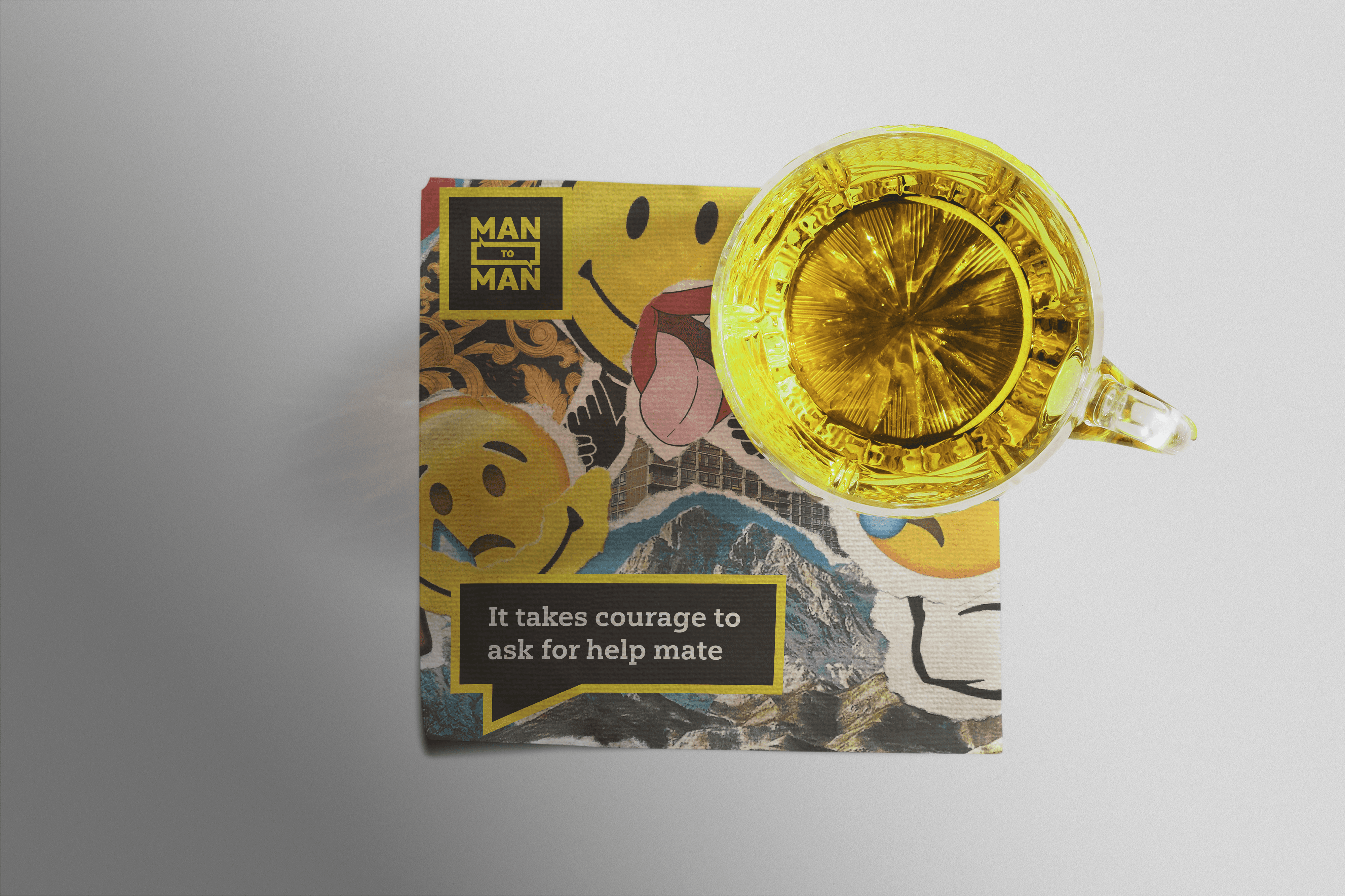 Man to Man is a campaign aimed at men who struggle to talk about their mental health. It uses eye-catching, informative visuals that reflect the confusion and chaos of modern masculinity, placed in familiar social spaces to spark meaningful conversations.