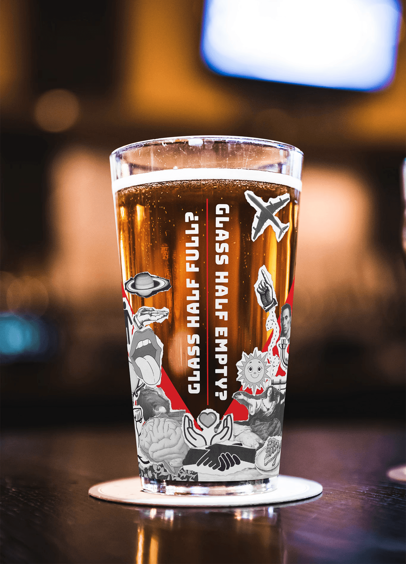The original brand aimed to stand out in busy bars with bold, attention-grabbing visuals. While that goal remains, shifting from a harsh “warning” yellow to a warmer, more inviting red has softened the overall tone. Confusion and chaos represented by rough collage was a key theme to keep, removing the saturation allows the imagery to appear more cohesive while still maintaining randomness.